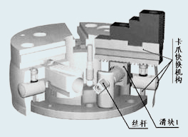 移动时,通过滑块顶部和卡爪底部斜齿的啮合将滑块的运动转换成卡爪的径向移动,夹紧或松开工件。